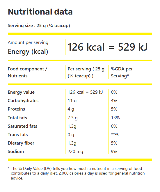 Peanuts, wheat flour enriched with iron and folic acid, sugar, modified starch, palm vegetable oil, prepared seasoning with garlic and lemon flavor, salt, starch, natural annatto color, sodium bicarbonate acidity regulator and flavoring.