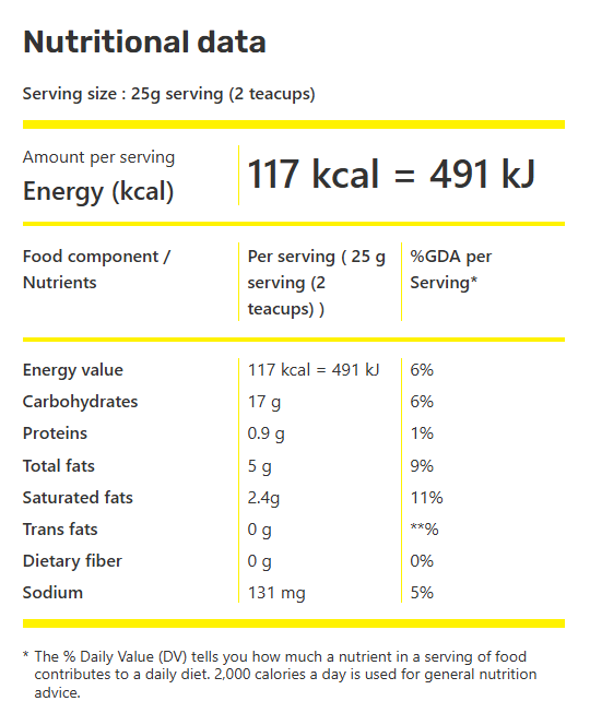 Corn flour* enriched with iron and folic acid, corn semolina* enriched with iron and folic acid, palm vegetable olein, natural annatto flavoring and coloring. *Ingredients containing genes from Bacillus thuringiensis, Streptomyces viridochromogenes, Agrobacterium tumefaciens, Zea mays, Sphingobium herbicidorovans, Discosoma sp, Bacillus substilis, Diabrotica firgifera and Thermoccocales spp.