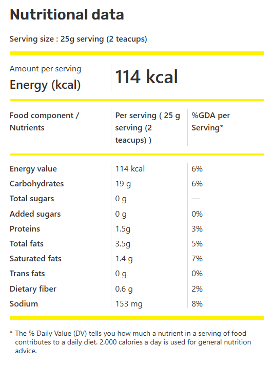 Corn flour enriched with iron and folic acid*, corn semolina enriched with iron and folic acid*, vegetable oil, flavoring and natural annatto color*. *Ingredients containing genes from Agrobacterium tumefaciens, Bacillus thuringiensis, Streptomyces viridochromogenes and Zea mays.
